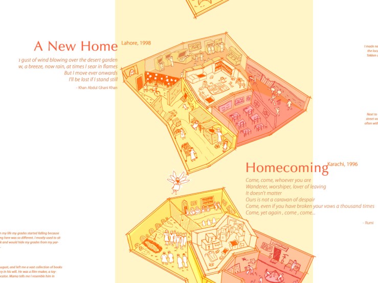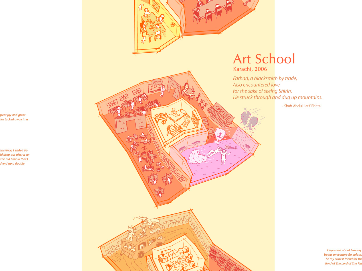 I then broke apart deformations of the model into separate floors, and exported them into Adobe Photoshop, where I illustrated the various rooms using a Wacom tablet. Interspersing the hand drawn visuals with snippets of sufi poetry and descriptions of what was going on in my life at the time, the poster gave an idea of where I had come from and what I valued.