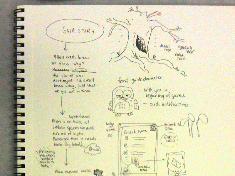 My team sought to teach children from grades 3-5 about sustainable practices through a mobile game called Gaia. By combining quests within the game with real world tasks,we tried to make engaging in sustainable practices fun and informative. By “helping” a character trying to revive his polluted, dying planet in the game by remembering to engage in activities that conserved energy and water and promoting the sharing and reuse of personal items, we hoped to reinforce sustainable habits in kids, while giving them incentives by immersing them within an engaging narrative that changed in realtime based on the childs progress and actions.